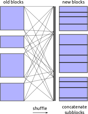 - Shuffle our old blocks into new blocks along the new partitions found in step one.