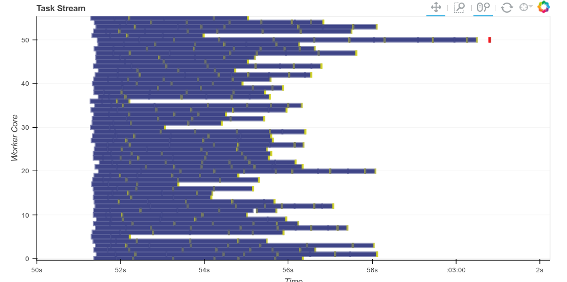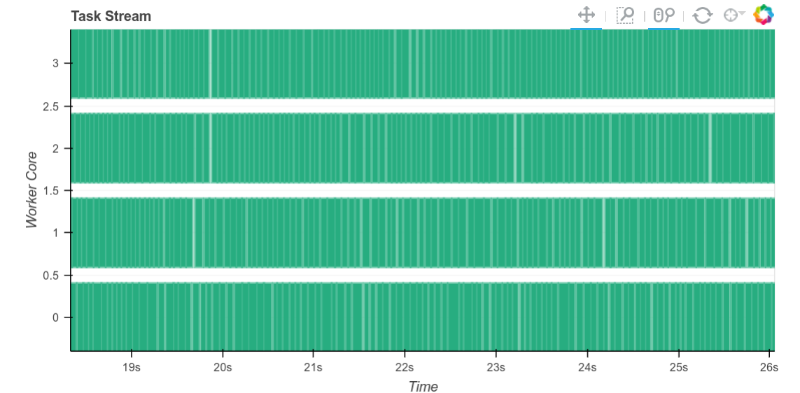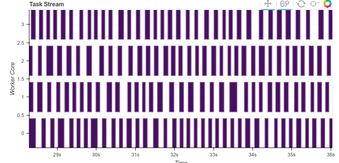 Explaining this in greater depth, recall that to schedule intelligently, the workers calculate the size in bytes of every intermediate result they produce. Often this is quite fast, for example for numpy arrays we can just multiply the number of elements by the dtype itemsize. However for object dtype arrays or dataframes (which are commonly used for text) it can take a long while to calculate an accurate result here. Now we no longer calculuate an accurate result, but instead take a fairly pessimistic guess. The gaps between tasks shrink considerably.