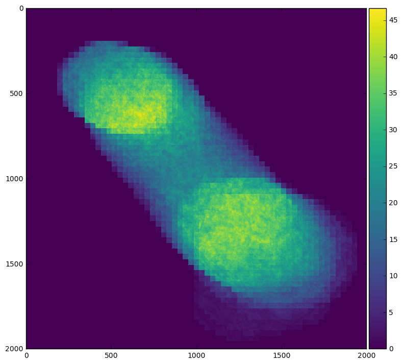 Now we compute the FFT of each pixel, take the absolute value and square to get the power spectrum. Finally to conserve space we’ll down-grade the dtype to float32 (our original data is only 8-bit anyway).