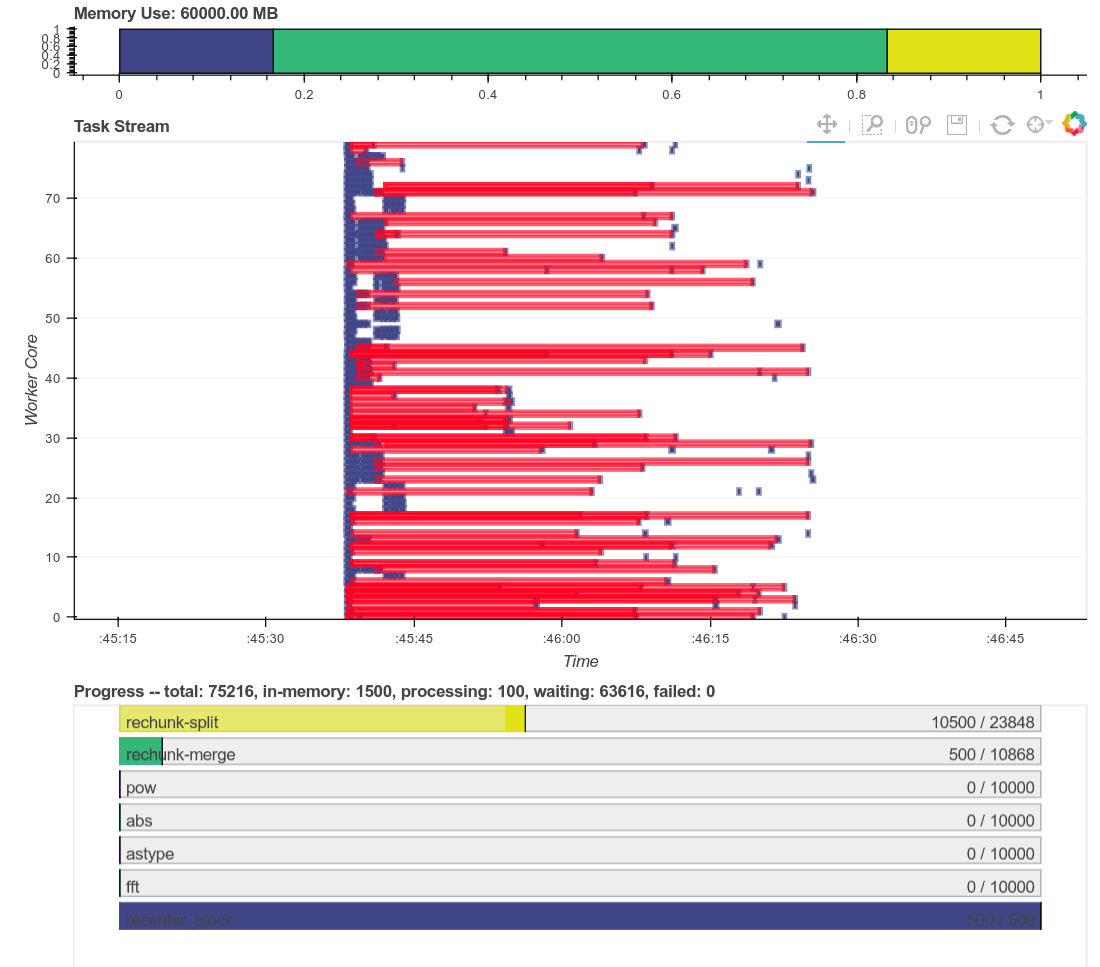 This is a fun profile to inspect; it includes both the rechunking and the subsequent FFTs. We’ve included a real-time trace during execution, the full profile, as well as some diagnostics plots from a single worker. These plots total up to around 20MB. I sincerely apologize to those without broadband access.