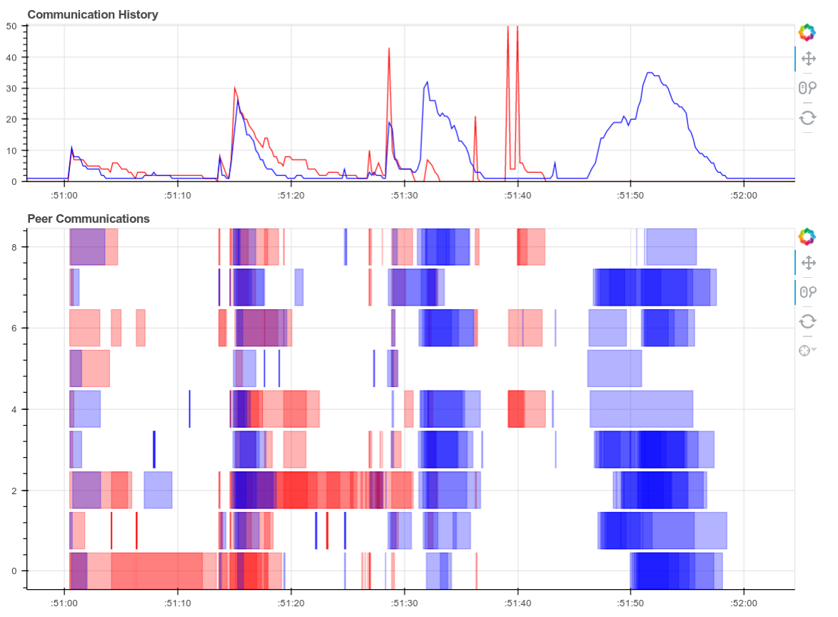 And here is a single interactive plot of the entire computation after it completes. Zoom with the tools in the upper right. Hover over rectangles to get more information. Remember that red is communication.