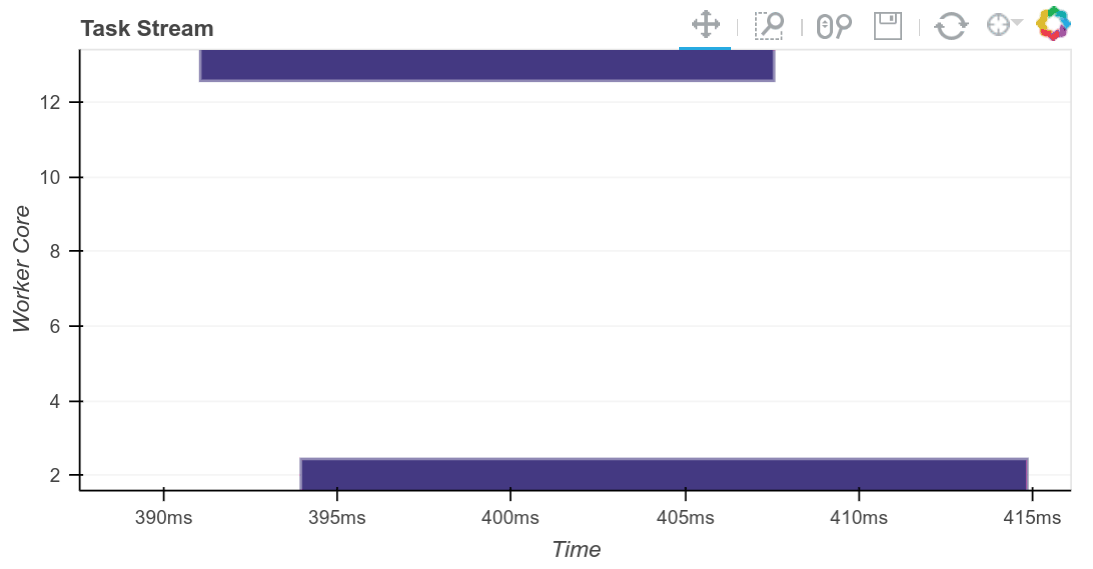 The completed Bokeh image below is interactive. You can pan and zoom by selecting the tools in the upper right. You can see every task, which worker it ran on and how long it took by hovering over the rectangles.