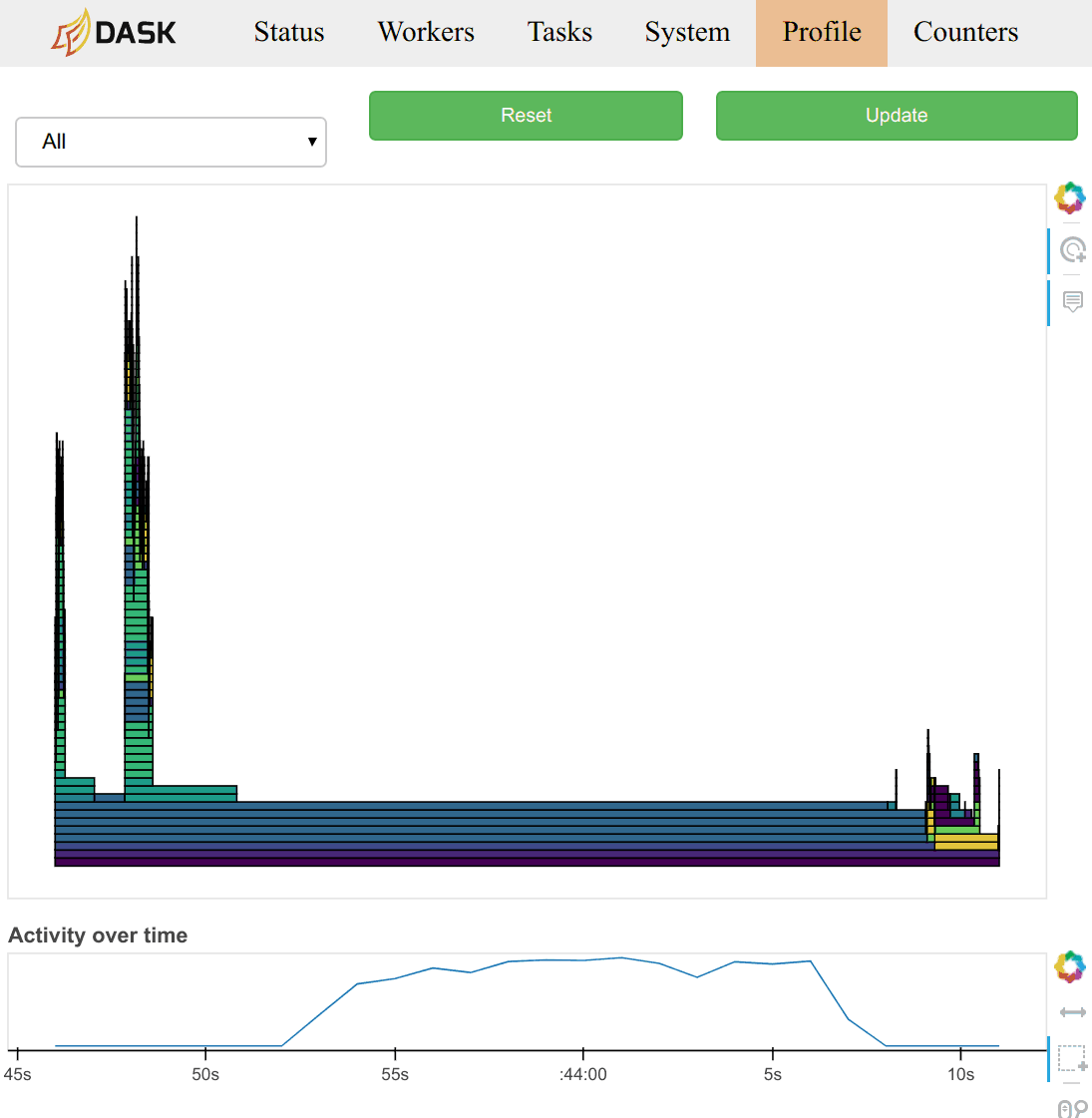 These plots are available on each worker, and an aggregated view is available on the scheduler. The timeseries on the bottom allows you to select time windows of your computation to restrict the parallel profile.
