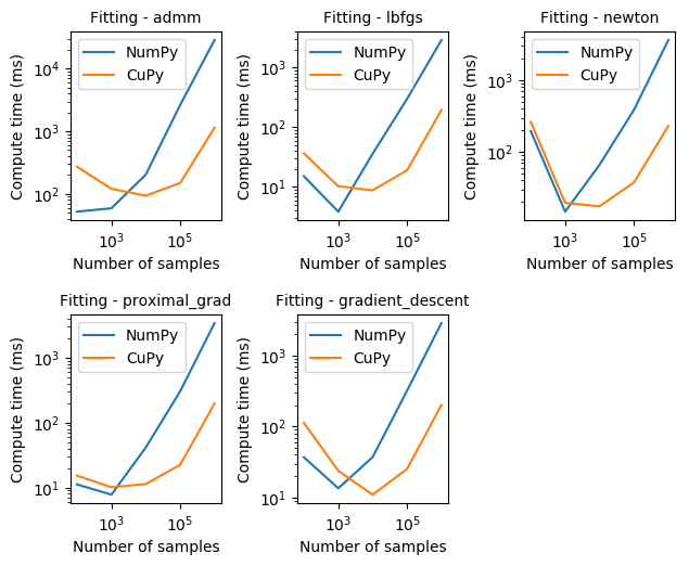For the simple example chosen for this post, scikit-learn outperforms Dask-GLM using both NumPy and CuPy arrays. There may exist several reasons that contribute to this, and while we didn’t dive deep into understanding the exact reasons and their extent, we could cite some likely possibilities: