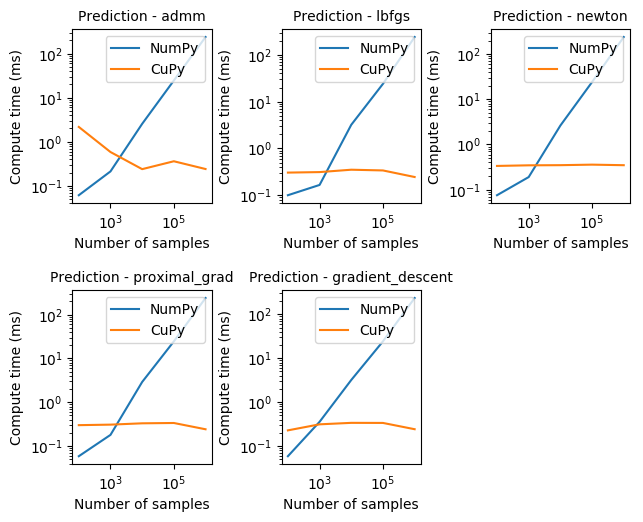 Prediction with CuPy, as seen above, can be proportionally much faster than NumPy, staying mostly constant for all solvers, and around 3-4 orders of magnitude faster.