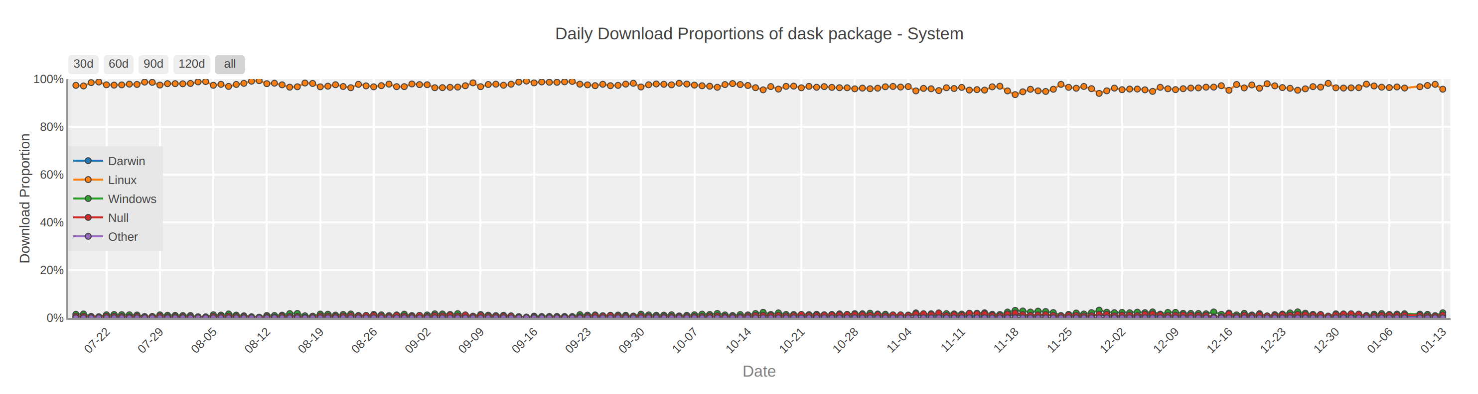 If you dive in more deeply to numbers like these you will find that they are almost entirely due to automated processes. For example, of Dask’s 100k new users, a surprising number of them seem to be running Linux.